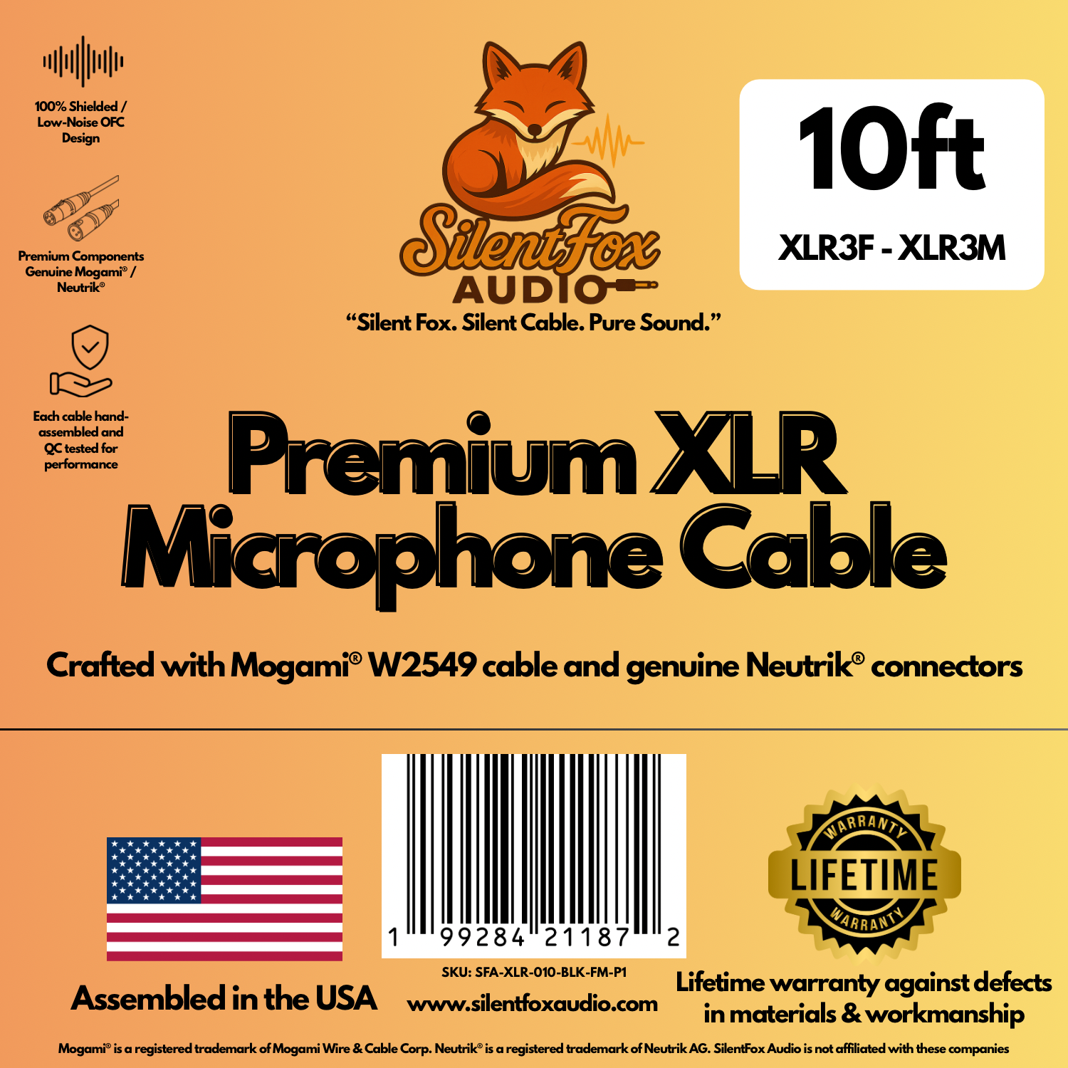 SilentFox Audio Premium XLR Microphone Cable, 10 ft, Black, XLR3F–XLR3M, Balanced